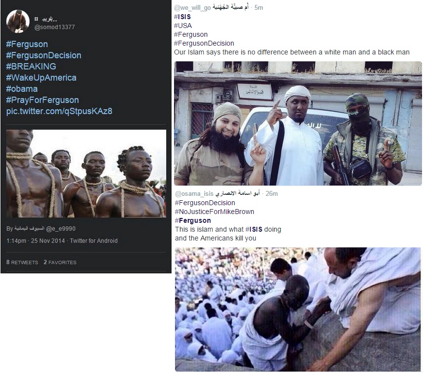 Στο ίδιο πνεύμα είναι και τα περισσότερα tweet, που προσπαθούν να πείσουν τους Αφροαμερικανούς ότι οι ΗΠΑ είναι μια χώρα ρατσισμού και διακρίσεων, ενώ το Ισλαμικό Κράτος και το Ισλάμ πιστεύει στην ισότητα όλων των ανθρώπων ανεξαρτήτου φυλής ή καταγωγής.