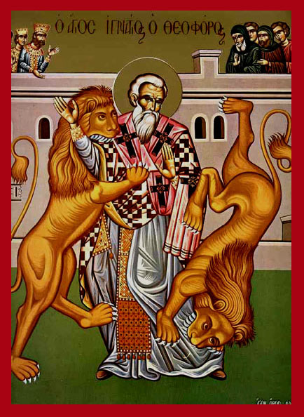 Ὅταν ἦρθε ἡ μέρα γέμισε τὸ ἀμφιθ έατρο. Ὁ Ἰγνάτιος στάθηκε ἐκεῖ μέσα ἀτάραχος. Φέρανε ἕνα κλουβὶ μὲ πεινασμένα λιοντάρια. Ἄνοιξαν τὴ σιδερένια πόρτα καὶ τὸ πρῶτο λιοντάρι πετάχτηκε ἔξω. Ἔπειτα ἄλλο. Καὶ ὥρμησαν ἴσια ἐπάνω του… Μπορεῖτε νὰ φανταστῆτε τὸ μαρτύριο· νὰ πέφτουν πάνω στὸν ἅγιο, νὰ ξεσχίζουν μὲ τὰ νύχια τὶς σάρκες του, νὰ γλείφουν τὰ αἵματα, καὶ ν᾿ ἀκούγωνται τὰ δόντια τους νὰ θραύουν τὰ ὀστᾶ του…