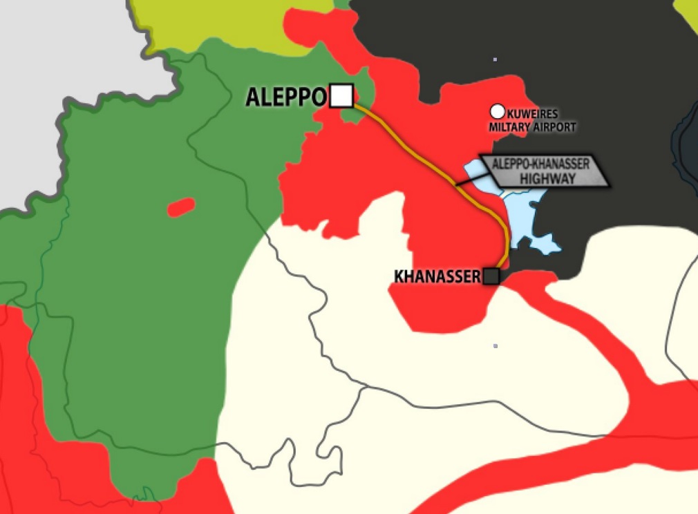 Με το πράσινο χρώμα τα εδάφη που ελέγχει η Αλ Κάιντα. Με το κόκκινο η κυβέρνηση και με το μαύρο το Ισλαμικό Κράτος. Η κίτρινη γραμμή είναι ο αυτοκινητόδρομος και η πόλη Χανασέρ είναι στο σημείο που οι τζιχαντιστές είχαν αποκόψει την οδό ανεφοδιασμού των κυβερνητικών στρατευμάτων που μάχονται βόρεια, μέσα και γύρω από το Χαλέπι.
