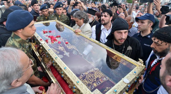 Χιλιάδες πιστοί υποδέχθηκαν την Κυριακή στην Αγία Βαρβάρα τα ιερά λείψανα της Αγίας Ελένης, μητέρας του Μεγάλου Κωνσταντίνου, από την Βενετία στην Αθήνα.