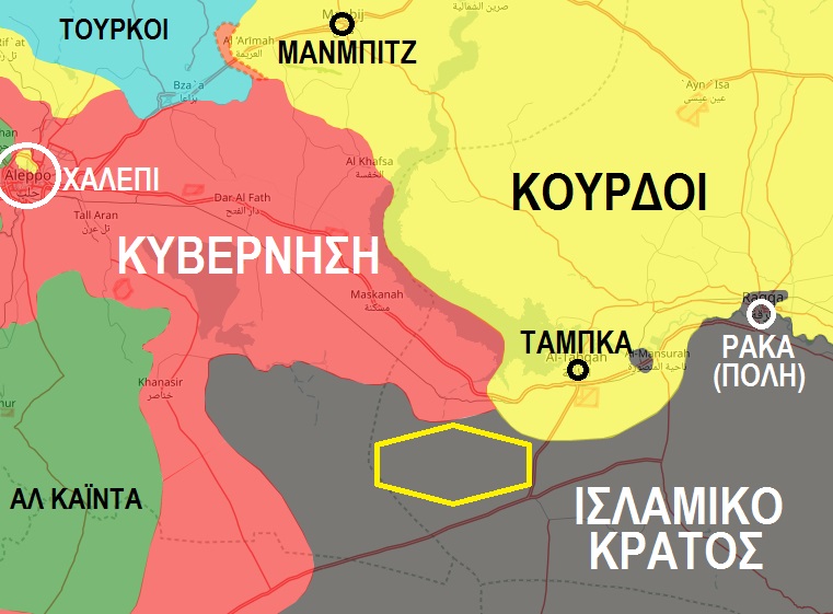 Το κίτρινο εξάγωνο σημαδεύει την περιοχή που άφησε πίσω του το Ισλαμικό Κράτος.
