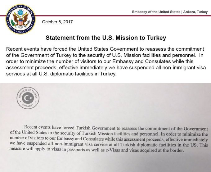 «Προκειμένου να ελαχιστοποιήσουμε τον αριθμό των επισκεπτών στην πρεσβεία μας και τα προξενεία μας ενώ βρίσκεται σε εξέλιξη η διαδικασία επανεκτίμησης, αναστείλαμε- με άμεση ισχύ- όλες τις υπηρεσίες έκδοσης θεωρήσεων εισόδου για μη μετανάστες σε όλες τις διπλωματικές εγκαταστάσεις των ΗΠΑ στην Τουρκία».