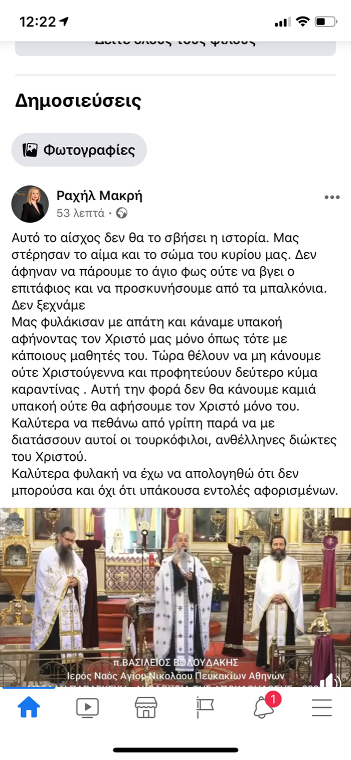 “Αυτό το αίσχος δεν θα το σβήσει η ιστορία. Μας στέρησαν το αίμα και το σώμα του Κυρίου μας. Δεν άφηναν να πάρουμε το Άγιο Φως ούτε να βγει ο επιτάφιος και να προσκυνήσουμε από τα μπαλκόνια. Δεν ξεχνάμε